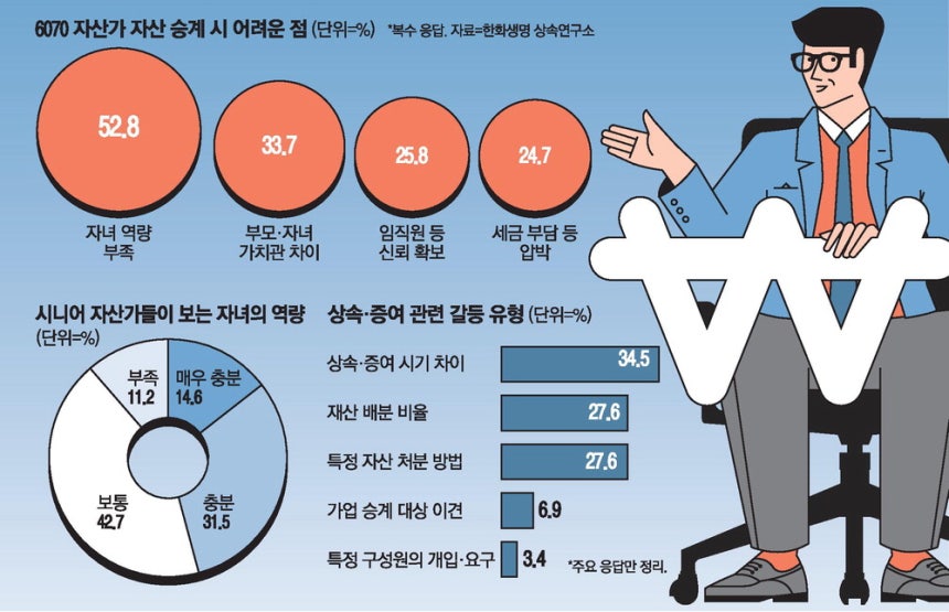 이러한 인식 차이는 상속의 난관으로 이어진다.시니어들은 자산 승계 시 최대 어려움으로 자녀의 역량 및 전문성 부족(52.8%)을 꼽았다.이어 가치관 차이(33.7%)와 임직원 등의 신뢰 확보(25.8%)를 걱정했다.세금 문제(24.7%)보다 자녀의 능력을 더 큰 리스크로 보고 있는 셈이다.