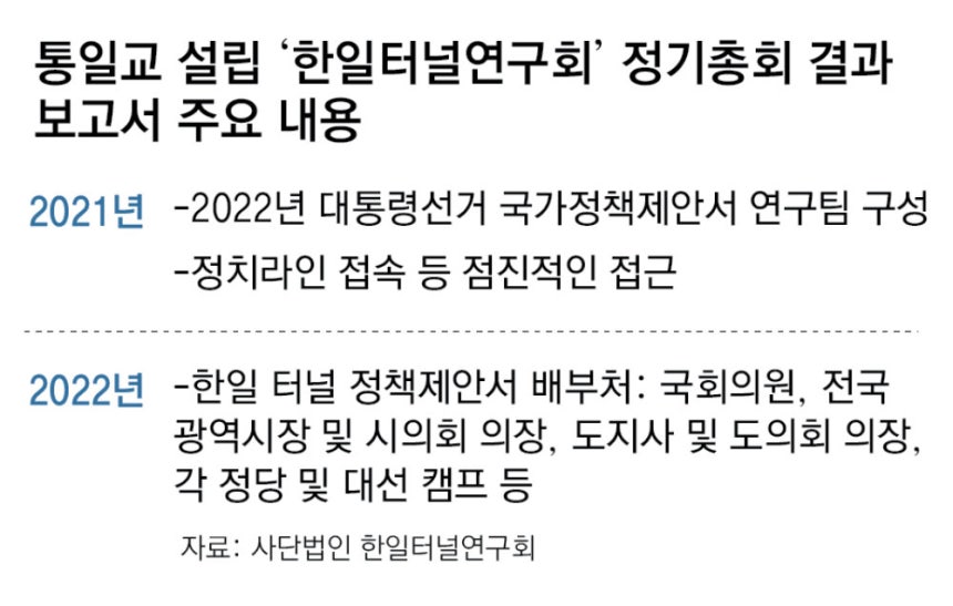 통일교 유관 단체‘한일터널연구회(현 신한일미래포럼)’의 2021,프로 포커2022년 정기총회 결과 보고서에 담긴 내용이다.통일교가 대통령 선거를 앞두고 한일 해저터널 실현을 위해 세운 계획이 단순한 구호를 넘어 조직적인 실행 로드맵으로 추진됐음이 공식 문건을 통해 드러난 것이다.