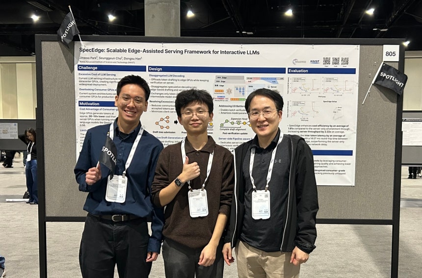 KAIST는 전기및전자공학부 한동수 교수 연구팀이 데이터센터 밖에 널리 보급된 저렴한 소비자급 GPU를 활용해 LLM 인프라 비용을 크게 낮출 수 있는 새로운 기술‘스펙엣지(SpecEdge)’를 개발했다고 28일 밝혔다.