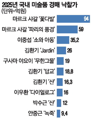 컬렉터들이 희소성이 높고 검증된 해외 거장의 명작에 강력한 구매력이 있다는 점을 보여준 사례다.샤갈의 또 다른 작품인 '파리의 풍경' 역시 같은 경매에서 59억원에 거래되며 올해 낙찰가 2위를 기록했다.
