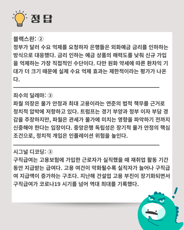 ■ 고환율·부동산 리스크에 한은 금리인하 여력 축소: 전문가 30%가 올해 금리인하가 없을 것으로 전망하며,인하하더라도 한 차례에 그칠 것이란 분석이 우세하다.원·달러 환율이 1470원을 돌파한 가운데 수출주 환차익과 내수주 부담이 동시에 부각되는 양상이다.