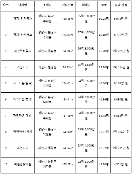 집품 관계자는 “이번 경기도 최고가 거래 상위 사례는 집값 상위권을 형성한 과천과 성남에 집중된 가운데 성남시에서는 분당구 수내동 거래가 두드러졌고 과천시에서는 원문동과 별양동에 거래가 몰렸다”며 “중대형 면적 거래가 상위권을 차지한 점을 고려하면 핵심 주거지를 중심으로 고가 거래가 형성된 흐름이 수치로 확인된다”고 말했다.