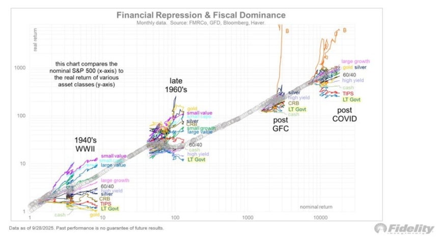 실제 피델리티가 글로벌 금융위기 이후,코로나 이후처럼 재정 지배가 두드러졌던 시기의 자산군별 수익률을 분석한 결과 장기 국채와 물가연동채권(TIPS),현금,하이일드채권,60/40 포트폴리오는 S&P 500보다 수익률이 낮았습니다.반대로 금·은과 대형 성장주,비트코인은 S&P 500 수익률을 상회했습니다.