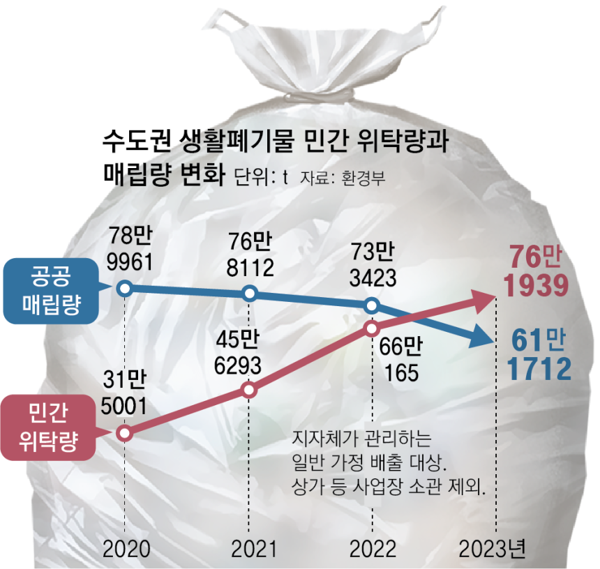 동아일보가 최근 4년간 수도권 생활폐기물 현황을 분석한 결과 2021년 폐기물관리법 시행규칙 개정으로 2025년부터 직매립 금지가 예고된 이후 민간에 쓰레기 처리를 맡기는 비율이 빠르게 늘어난 것으로 나타났다.2020년 약 32만 t이던 민간 위탁량은 2023년 76만 t으로 3년 만에 2.4배로 증가했다.전체 생활폐기물 가운데 민간 처리 비중도 같은 기간 9.2%에서 20.9%로 크게 뛰었다.