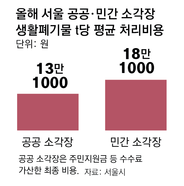 민간 의존도가 커질수록 쓰레기 처리 비용은 오를 수밖에 없다.서울시에 따르면 올해 기준 민간 소각시설 t당 평균 처리 비용은 공공보다 약 38% 비싸다.이에 한 자치구는 관련 예산을 올해 48억9200만 원에서 내년 67억1000만 원으로 37% 증액했다.인천 서구 역시 민간 소각장 이용이 늘면서 연간 처리 비용이 약 90억 원에서 120억 원으로 증가했다.