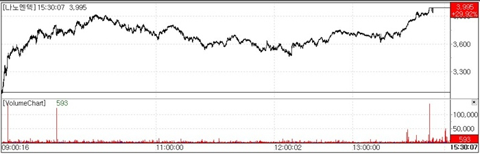 나노엔텍(039860)은 이날 오전부터 강세를 보이다 오후 들어 상한가로 직행했다.주가는 전일 대비 29.92%(920원) 오른 3995원으로 마감하며,올해 1월 9일 4140원 기록 이후 약 11개월 만에 4000원대 진입을 눈앞에 뒀다.