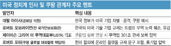 쿠팡 내부에서도 미국 정부를 겨냥한 대외 메시지가 강화되는 모습이다.로버트 포터 쿠팡 글로벌 대외협력 최고책임자는 이달 초 미국 워싱턴에서 열린 국제무역협회 포럼에 참석해 “(한미 공동 팩트시트에는) 망 이용 대가나 온라인 플랫폼 규제에 관한 구체적인 문구들이 담겨 있는데,이는 한국 정부와 국회가 추진하겠다고 위협해 온 것”이라며 “(한미 합의는) 미국 기업과 미국의 이익이 여러 시장에서 직면하고 있는 미묘한 특정 이슈,특정 위협,그리고 특정 장벽들에 대해 양자 간 협정이 얼마나 세부적으로 파고들 수 있는지를 보여주는 사례가 될 것”이라고 말했다.