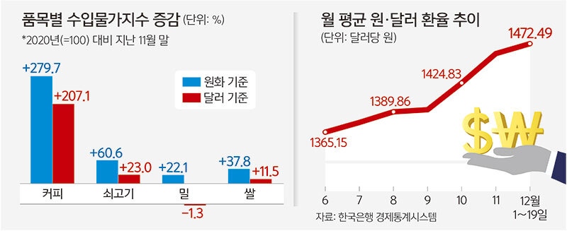 한은이 집계한 수입물가지수(2020년=100)에 따르면 지난달 커피 수입물가는 달러 기준으로 307.12이지만 원화 기준으로는 379.71로 나타났다.커피 국제시세가 급등하며 달러 수입 단가도 5년 새 3배로 올랐는데,환율 영향을 반영하면 거의 4배가 된 것이다.