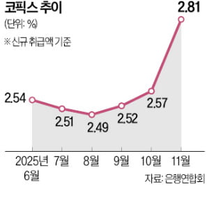 기준금리가 5월 이후 줄곧 그대로인데도 최근 코픽스가 튀어 오른 것은 기준금리 추가 인하 기대가 약해졌기 때문으로 풀이된다.이 영향으로 은행채 금리와 예·적금 금리가 모두 치솟았다.금융투자협회에 따르면 5년 만기 은행채(무보증·AAA) 평균 금리는 10월 31일 연 3.115%에서 11월 28일 연 3.429%로 한 달 만에 0.314%포인트 급등했다.정기예금 금리도 연 3%대 상품이 다시 등장하는 등 상승세가 이어지고 있다.
