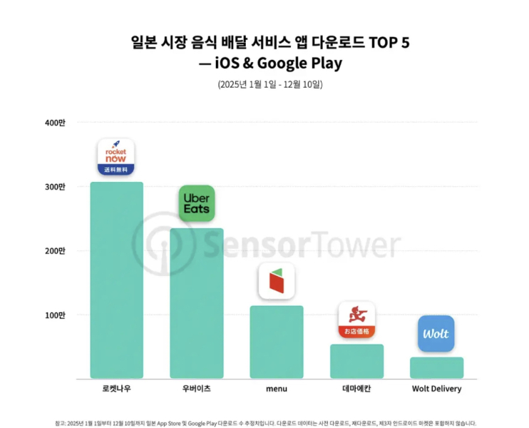 19일 글로벌 마켓 인텔리전스 기업 센서타워에 따르면 쿠팡이츠의 일본 배달앱 '로켓나우'는 올해 다운로드 수 300만건을 넘어섰다.이는 같은 기간 일본 배달앱 전체 다운로드 수의 약 30%로,가장 많이 내려받은 앱으로 기록됐다.