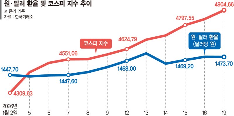 19일 한국거래소에 따르면 이날 오후 3시30분 기준 서울 외환시장에서 원·달러 환율은 전일 대비 0.10원 오른 1473.70원에 거래됐다.하지만 이날 코스피는 장중 전날보다 1.58% 오르며 4917.37까지 오르는 등 사상 처음으로 4900선을 돌파했다.