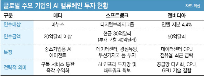주목할 점은 세 기업의 투자 전략이 각기 다르다는 점이다.메타는 즉각적인 수익 창출이 가능한 AI 에이전트 구독 서비스를 확보했다.소프트뱅크는 AI 구동에 필수적인 데이터센터 인프라 투자망을 손에 넣었다.엔비디아는 인텔과의 협력으로 공급망 다변화 가능성을 열어뒀다.