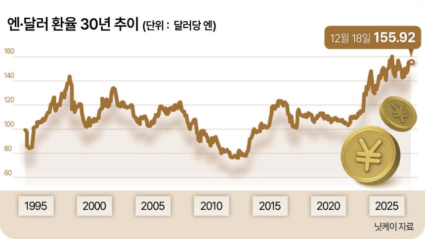 ▶日 금융정책 정상화 탄력…‘역대급 엔저’달라질까= 일본은행이 기준금리를 인상하고 미국 연방준비제도(Fed)가 금리 인하 국면에 들어섰음에도 엔화는 뚜렷한 강세 전환에 실패하고 있다.이날 도쿄 외환시장에서 엔·달러 환율은 155엔대에서 제한적인 등락을 이어갔다.니혼게이자이신문(닛케이)과 파이낸셜타임스(FT)는 미·일 10년물 국채 금리 차가 눈에 띄게 줄었지만,환율은 오히려 엔저 국면을 벗어나지 못하고 있다고 분석했다.