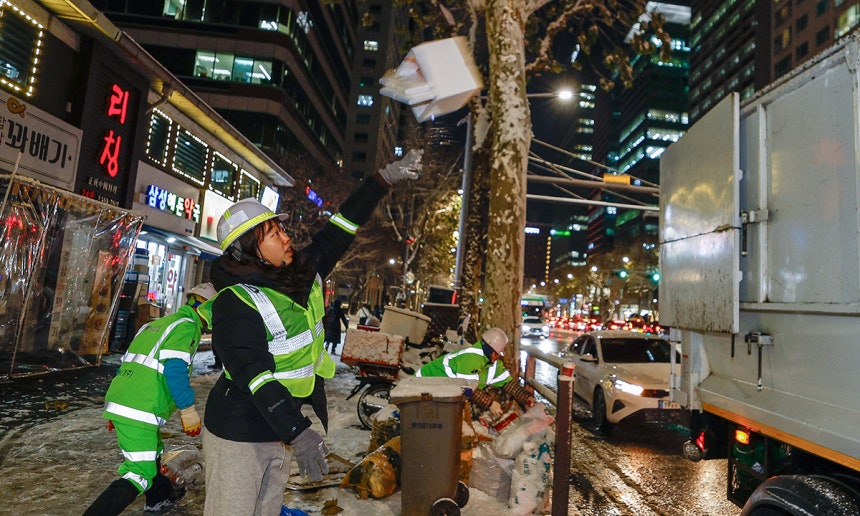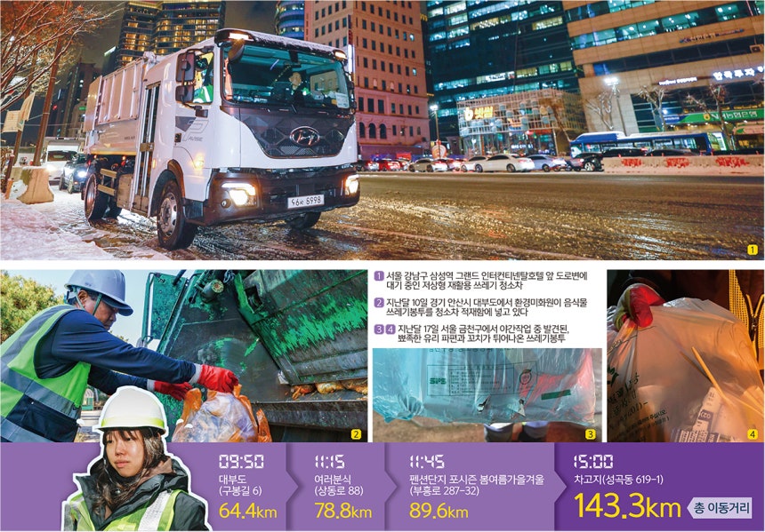 서울 강남구 환경미화원 나인수(69)씨와 이천식(60)씨는 삼성역 앞 그랜드 인터컨티넨탈 호텔 창에서 쏟아내는 노란 불빛을 받으며 재활용 쓰레기를 던지고 있었다.이씨는 눈이 소복이 쌓인 재활용 수거함에서 쓰레기가 가득 찬 봉투를 꺼냈다.그는 투입구를 말아 쥔 뒤 청소차 측면에서 적재함을 향해 봉투를 날렸다.나씨는 “가벼운 건 그냥 던져버린다”라며 맥주병이 비치는 묵직한 봉지를 또 한 번 띄웠다.그는 “보통 사람은 10개 던지면 2개가 들어갈까 말까다.우린 10m 뒤에서도 골인한다”고 말했다.