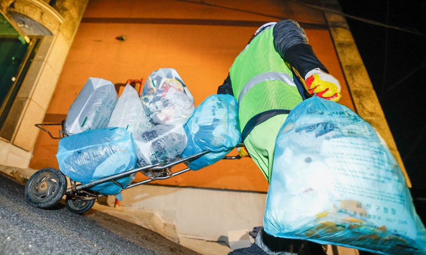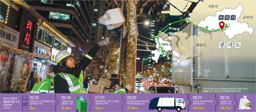 지난달 10일 오전 6시,경기도 안산시 고잔동 로데오 상가거리.5t 압착진개차 뒤편에서 25년째 근무 중인 환경미화원 홍석환(58)씨와 동료는 양손에 쥔 일반 쓰레기봉투를 적재함으로 던졌다.