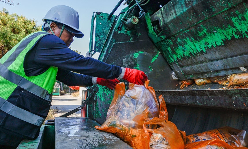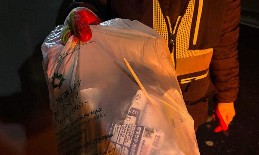동틀 무렵,경기 안산시의 주간 수거 현장에서는 쓰레기의 형태가 그대로 드러났다.어둠 속에서 봉투를 더듬어 던질 필요는 없었다.대신 압착진개차에서 터진 쓰레기봉투 속 음식물과 각종 오염물이 고스란히 눈에 들어왔다.