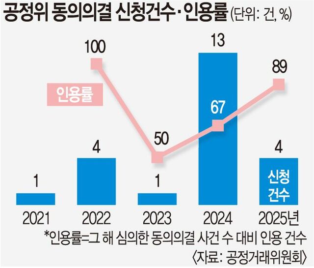쿠팡의 하도급법 위반 사례에 대한 동의의결은 아직 결과가 나오기 전이다.하지만 동의의결 절차를 개시했다는 것 자체만으로도 시정 조치로 결론을 내리려는 것 아니냐는 의구심이 제기된다.동의의결 개시를 민감하게 보는 데는 이유가 있다.제재 대신 자체 시정으로 전환하느냐 마느냐의 판단이 주로 절차‘개시 단계’에서 이뤄지기 때문이다.공정위는 개시 단계에서 동의의결에 적합한 사건만 엄격히 선별한다.인용률로도 확인된다.최근 5년간 동의의결 인용률은 연도에 따라 최대 100%에 달했다.한 번 절차가 개시된 이후 중도에 철회된 사례도 없었다.