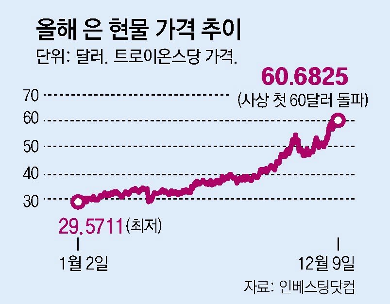9일(현지 시간) 미국 블룸버그 통신에 따르면 이날 은 현물 가격은 전날 대비 4.5% 오른 트로이온스당 60.8달러에 거래됐다.은 가격이 역사상 처음으로 트로이온스당 60달러의 벽을 넘긴 것이다.금융 정보 플랫폼 인베스팅닷컴 집계 기준으로 지난해 말 트로이온스당 28.9달러였던 은 가격은 올해 들어 110.2% 상승했다.