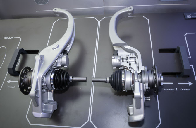 현대위아는 전기차에서 구동축과 바퀴를 필요에 따라 분리하는 시스템인‘휠 디스커넥트 시스템(WDS)’도 선보였다.불필요한 구동력의 낭비를 줄여,전비를 높이고 주행거리를 그만큼 향상하는 부품이다.현대위아 부스에서는 휠과 구동축을 분리해 휠만 독립적으로 움직이는 모습을 확인할 수 있다.