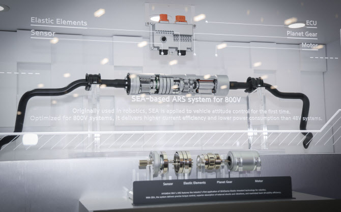 현대위아가 공개하는 ARS(Active Roll Stabilization)도 구동 성능을 한 단계 끌어 올려주는 미래 모빌리티 부품이다.ARS는 울퉁불퉁한 도로를 주행할 때나 선회 시에 자동차의 기울어짐을 크게 줄여주는 부품이다.노면에서 올라오는 충격과 진동을 정밀하게 감지해서 차량 자세를 제어하는 방식이다.현대위아는 ARS에 자동차 업계 최초로 로봇 기술인‘직렬-탄성 액추에이터’를 적용했다.이를 통해 아주 정밀하게 토크를 제어하고 동시에 외부 충격과 진동을 흡수하도록 했다.