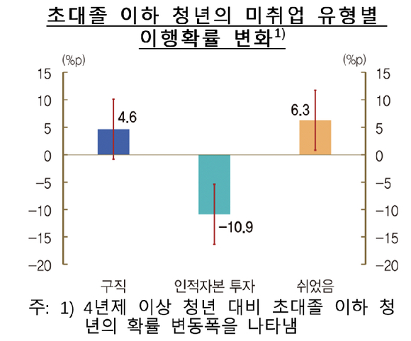 취업 가능성이나 기대 소득을 높이기 위해 교육·훈련에 참여하는 미취업 상태인 인적자본 투자 상태에 있을 확률은 10.9%p 낮았다.