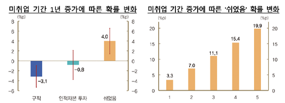 미취업 기간의 영향도 뚜렷했다.미취업 기간이 1년 늘 때 '쉬었음' 상태에 있을 확률은 4.0%p 상승했다.구직 확률도 3.1%p 하락했다.