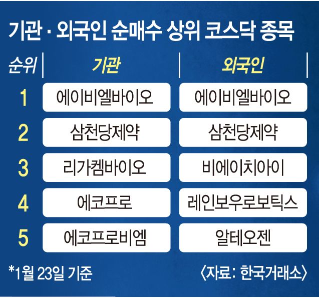 기관은 최근 주가가 급락한 바이오주를 중심으로‘줍줍’에 나섰다.23일 기관이 가장 많이 산 종목은 에이비엘바이오(621억원)다.알테오젠 여파로 10% 넘게 급락한 에이비엘바이오는 기관 주도 매수세에 10.24%나 급등했다.코스닥 바이오주는 시가총액 1위 알테오젠이 글로벌 빅파마 머크에게서 받기로 한 로열티 조건이 예상을 밑돌자 21일 동반 급락했었다.
