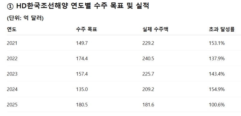 HD한국조선해양은 2021년부터 2025년까지 K조선사 중 유일하게 5년간 수주 목표 달성 행보를 이어가고 있기에 단순한 포부가 아니다.주력인 LNG 운반선을 비롯해 글로벌 시장 환경과 수주 전략 등을 꼼꼼히 계산한 끝에 나온 수치라 의미가 남다르다.