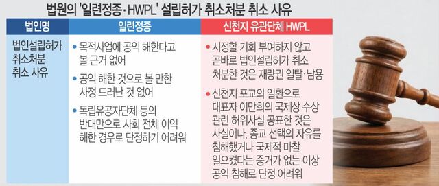 신천지 관련 사단법인 하늘문화세계평화광복(HWPL) 사건도 비슷하다.서울시는 2020년 4월 HWPL이 신천지 교주 이만희씨가‘유엔에서 국제상을 수상했다’는 허위사실을 공표하는 등 공익 침해행위를 했다는 이유로 법인설립허가를 취소했다.회원자격 취득 절차를 위반하고 정기총회를 미개최했다는 설립허가 조건 위반도 사유로 포함됐다.
