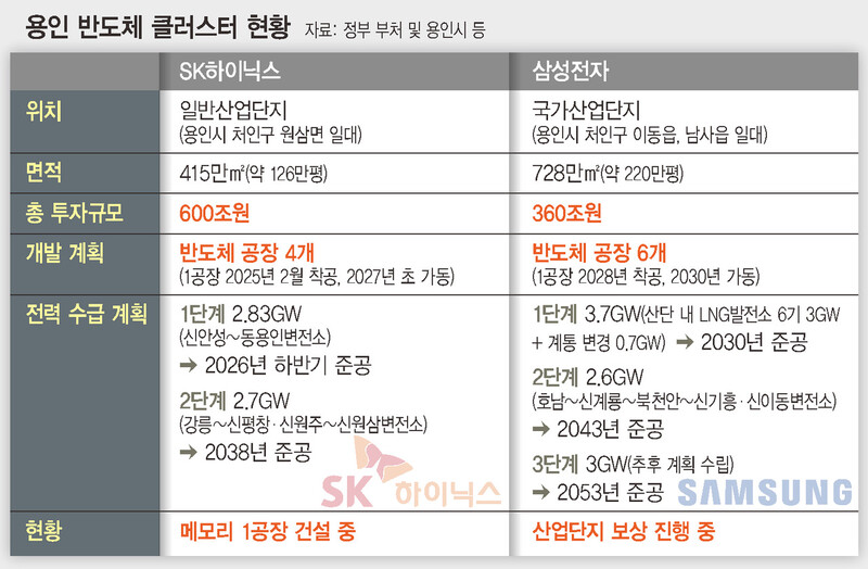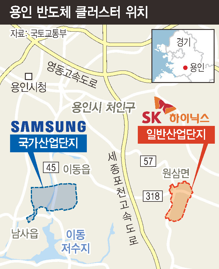 세계 최대 규모의 반도체 산업 집적지로 조성 중인 용인 반도체 클러스터는 크게 두 축으로 이뤄져 있다.용인시 남동쪽의 원삼면 일대 일반산업단지엔 하이닉스가,남서쪽의 이동·남사읍 내 국가산업단지엔 삼성전자가 초대형 반도체 공장을 짓는다.전체 신설 공장 수만 무려 10개다.삼성전자의 기흥·화성·평택 공장,하이닉스의 이천·청주 공장 중심부에 현재 가동 중인 국내 반도체 공장들의 절반에 육박하는 생산시설이 이들 지역에 추가로 들어서는 것이다.