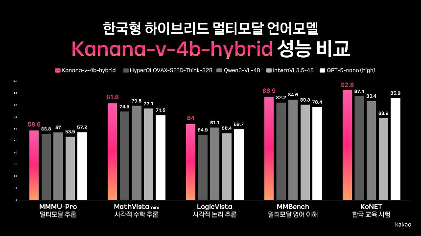 카카오는 5일 가벼운 일상 대화부터 논리적 사고가 필요한 복잡한 문제 해결까지 하나의 모델로 처리할 수 있는 자체 개발 신규 AI 모델 'Kanana-v-4b-hybrid'의 성능을 공개했다고 밝혔다.