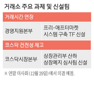 한국거래소가 거래시간 연장과 코스닥 '다산다사' 구조 확립이라는 내년 핵심 과제에 대비해 원포인트식 조직개편을 단행한다.결제 주기 단축 등 굵직한 제도 변화를 준비하기 위한 사전 대비 성격의 움직임이다.