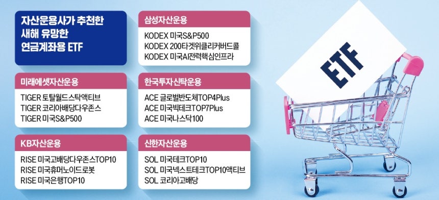 특정섹터 집중 ETF도 눈길내년에는 연금계좌에 어떤 상장지수펀드(ETF)를 담아야 할까.삼성자산운용,미래에셋자산운용,한국투자신탁운용,KB자산운용,신한자산운용 등 주요 자산운용사 다섯 곳은 미국 인공지능(AI) 주식과 국내 고배당주 ETF를 추천했다.최근 AI‘거품론’으로 주가 변동성이 커지긴 했지만,장기적으로 AI산업이 시장을 이끌 핵심 동력이 될 것이라는 전망에서다.또 내년부터 배당소득 분리과세가 시행되면서 국내 고배당주에 대한 관심도 높아질 것으로 분석됐다.