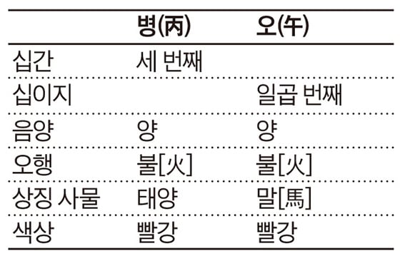 다른 방법들로는 丙午라는 글자에 대한‘해석학’이다‘2026’이란 숫자를 보고 우리는 어떤 의미를 찾을 수 없다.그러나‘丙午’라는 글자를 두고는‘논문’한 편을 써도 부족할 정도로 해석에 해석을 거듭할 수 있다.그 두 글자에는 십간·십이지·음양·오행이 다 들어가 있기 때문이다.이것들은 점술의 도구가 아니라 동아시아에서는 세계를 해명하고 표현하려는‘언어’였다.전통적으로 서양이‘원인→결과‘물질→법칙’으로 세계를 설명했다.반면 동아시아는 위로는 왕조의 출현에서 아래로는 한 개인의 흥망성쇠 등을‘기(氣)의 흐름과 변화’로 설명하려 했다.십간·십이지·음양·오행은 그 설명을 위한 기본 문법이었다.병오(丙午)를 도표로 표기하면 다음과 같다.