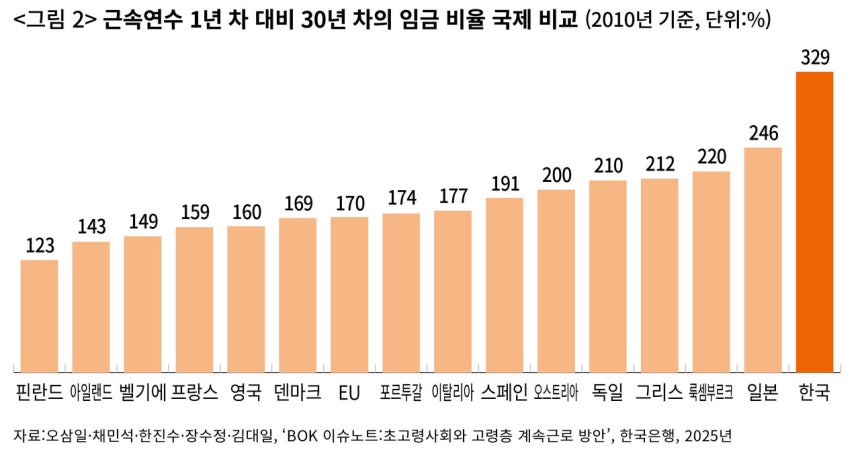 한국의 노동조합은 정년을 연장해달라고 하는 반면,프랑스 노동조합은 정년 연장 반대 시위를 벌인다.정년의 개념이 다르기 때문이다.김상배 프랑스 고등사회과학연구원(EHESS) 경제학 박사는 “유럽에도 비정규직이 있지만 대부분은 기한 제한이 없는 노동계약을 맺는 정규직이다.그래서 노동자들이‘나는 언제까지 일을 해야 되나,어느 시점에는 임금소득이 아닌 연금으로 생활하게 해달라’고 오히려 국가에 요구한다.그래서 정년이 연장되면 노동자들이 반발한다.연금 받지 말고 더 일하라는 뜻이니까.반면 한국은 고용주가 이 직원을 언제까지 채용해야 하는지(즉 언제부터 내보내도 되는지) 국가가 정한 나이가 정년이다”라고 말했다.이런 의미의 정년은 한국과 일본 정도에만 있다.연공서열형 임금체계에서나 의미가 있는 개념이기 때문이다.그런데 앞서의 한국은행 보고서에 따르면 한국 30년 차 노동자의 임금은 1년 차보다 3.4배 더 높다.이는 EU 평균(1.7배)은 물론 임금 연공성이 강하다는 일본(2.5배)보다 높은 수준이다(그림 참조).