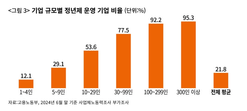 ‘법정 정년 60세’라고 하지만,정작 정년제를 운영하는 사업장은 전체의 21.8%에 불과하다(고용노동부‘2024년 6월 말 기준 사업체노동력조사 부가조사’).300인 이상 대기업의 95.3%가 정년제를 운영하지만 5인 미만 영세기업은 12.1%만 정년 제도가 있다고 답했다.60세 인구 중에서 생애 가장 오래 일한 일자리에서 계속 일하고 있는 사람은 37.6%다.55~64세 취업 경험자 중 가장 오래 근무한 일자리를 그만둘 당시 평균연령은 49.4세로 50세가 채 안 되며‘사업 부진,조업 중단,케이 리그 일정휴·폐업’때문에 그만둔 경우가 29.1%로 가장 많다(2024년 5월 경제활동인구조사 고령층 부가조사).
