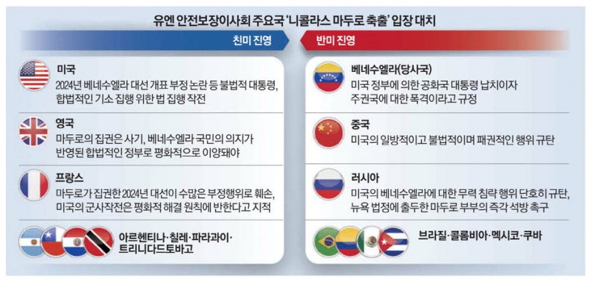 5일(현지시간) 뉴욕 유엔본부에서 열린 유엔 안전보장이사회(안보리) 긴급회의에선 미국의 마두로 전 대통령 체포에 대해 안보리 상임이사국인 미국·영국·프랑스와 중국·러시아 간 극명한 입장차가 드러냈다.
