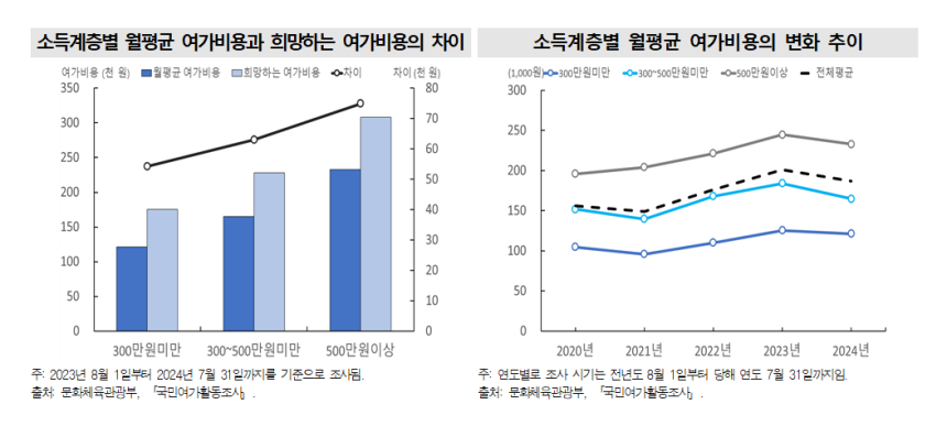 소득 계층별 여가 행태에서도 격차가 확인됐다.가구소득 500만원 이상 집단의 월평균 여가비용은 23만3000원으로,300만원 미만 집단(12만1000원)의 약 1.9배였다.
