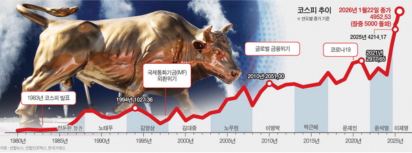 2024년 12월 30일 코스피 종가는 2399.49에 그치는 등 2024년은 12·3 비상계엄 여파로 한국 경제가 위태로웠다.지난해 6월 이재명 정부 출범 이후 증시 부양 기조와 불확실성 해소로 지수가 3000을 회복했고 10월 27일에는 드디어‘4000 시대’를 열었다.코스피는 올해 들어 12거래일 연속 100포인트씩 상승해 이날‘5000 포인트’를 달성했다가 4952.53으로 장을 마쳤다.