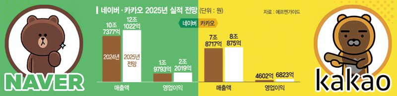 25일 금융정보업체 에프앤가이드에 따르면 네이버와 카카오의 지난해 매출액과 영업이익은 역대 최고 수준으로 예상된다.네이버의 지난해 연결기준 매출액은 2024년 대비 12.71% 늘어난 12조 1022억원으로 집계됐다.지난해 영업이익 전망치는 2조 2019억원으로,전년 대비 11.25% 늘어났을 것으로 추산된다.네이버는 지난 2024년 매출 10조원 최초 돌파에 이어 또 다시 매출 최대치를 경신했고,연간 영업이익 2조원을 넘기는 것도 처음이다.