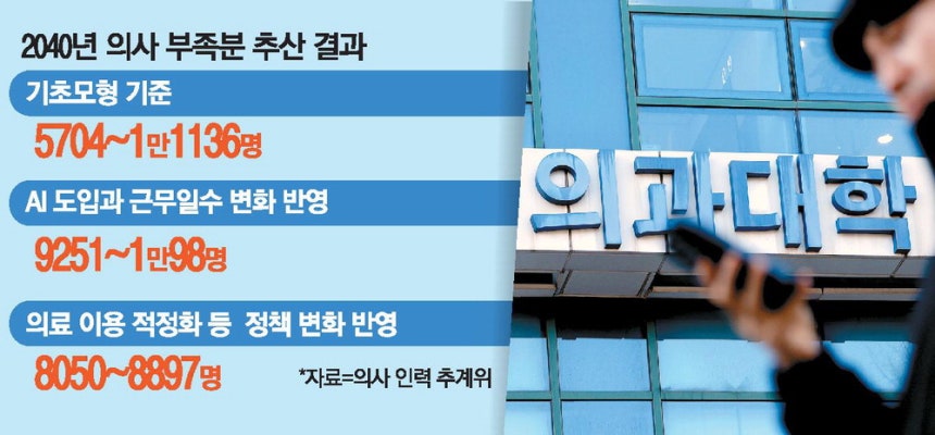 2040년 국내 의사 수가 최대 1만1000여명 부족할 것이라는 추계 결과가 나왔다.의료쇼핑하듯 병원을 다니는 과다진료를 줄이고 임상 현장에 인공지능(AI)을 접목할 경우를 가정해도 8000~1만명이 모자라다는 추론이다.당장 내년도 의과대학 정원을 늘려야 한다는 주장에 힘이 실릴 수 있는 결과여서 주목된다.