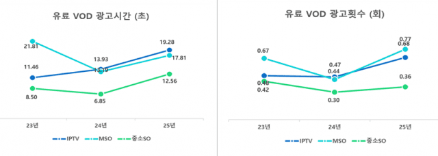 평가 결과,유료 VOD 한 편에 대한 평균 광고 횟수는 0.53회로 지난해 0.37회 대비 0.16회 증가했다.VOD 한 편에 대한 평균 광고 시간은 올해 15.29초로 지난해 9.97초와 비교해 5.32초 증가했다.