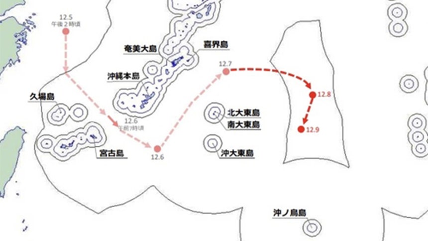 랴오닝함은 미나미다이토지마와 오키노토리시마(沖ノ鳥島·중국명 충즈냐오 암초) 사이 해역에서 남하하는 것으로 알려졌습니다.