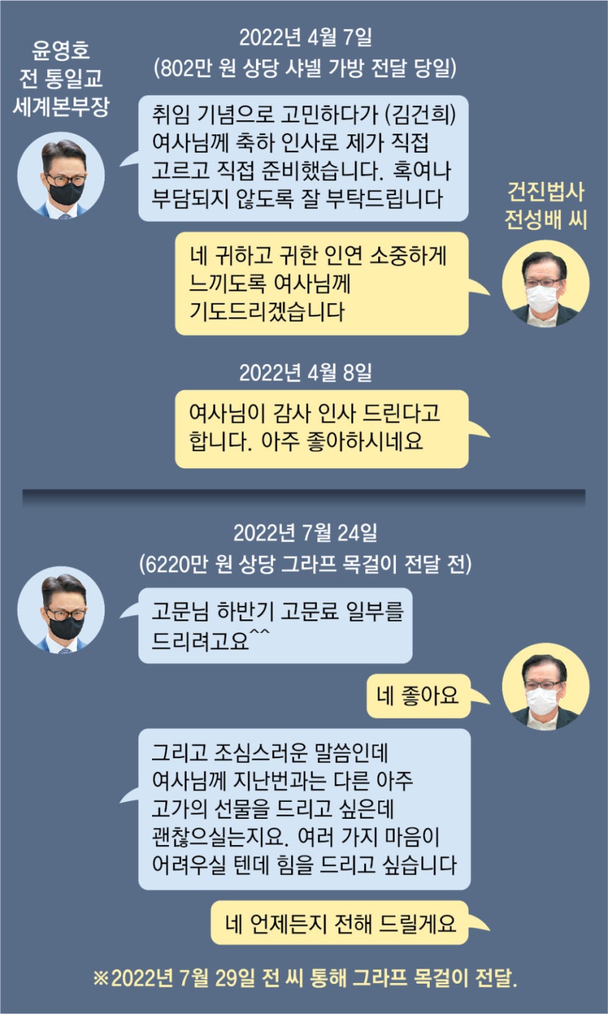 윤 전 본부장은 2022년 7월 24일 전 씨와 점심 약속을 잡으면서 “지난번과는 다른 아주 고가의 선물을 드리고 싶은데 괜찮으실는지”라며 운을 뗐다.전 씨는 “언제든지 전해 드릴게요.여사님 마음 여시면 화통하세요”라고 답했다.윤 전 본부장은 5일 뒤 전 씨에게 6000만 원이 넘는 그라프 다이아몬드 목걸이를 건넸다.이후 전 씨는 윤 전 본부장에게 “여사님이 큰 선물이라고 놀라셨지만 별다른 말씀은 없어요.연락 주실 겁니다”라는 메시지를 보냈다.