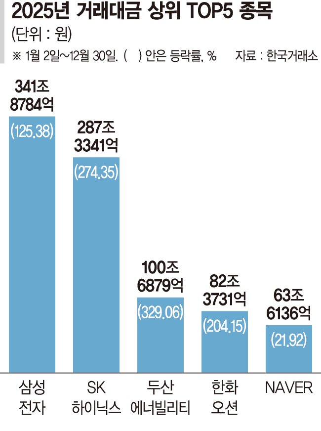 거래대금 상위 종목들은 주가 흐름에서도 비교적 강세를 나타냈다.삼성전자(125.38%)와 SK하이닉스(274.35%),두산에너빌리티(329.06%),한화오션(204.15%) 등은 모두 연초 이후 세 자릿수 수익률을 기록하며 지수 상승을 이끌었다.