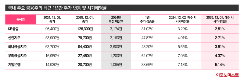 그런데 지난 1년동안 금융주 가격이 큰 폭으로 뛰면서 뒤늦게 들어간 투자자가 기대할 수 있는 배당률이 뚝 떨어졌다.2025년 12월 1일 기준 KB금융지주의 종가는 12만6300원으로 1년 전보다 31%가량 올랐다.신한지주는 5만3900원에서 7만9700원으로 47.87% 증가했고 하나금융지주는 6만3700원에서 약 3만원 오른 9만4400원을 기록했다.이들 금융주의 주가 상승률이 30~50%에 육박했던 셈이다.