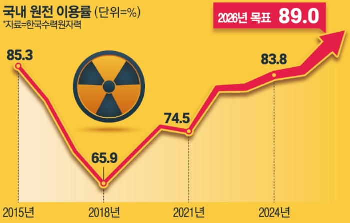 13일 기후부는 이러한 내용을 골자로 하는 에너지 분야 공공기관 업무보고 내용을 발표했다.업무보고에서 한국수력원자력은 올해 원전 이용률을 89%까지 높여 전력수급 안정과 전기요금 부담 완화에 이바지하겠다고 밝혔다.이는 지난해 이용률 84.6%보다 4.4%포인트 오른 수치이자,2011년 이후 가장 높은 수준의 이용률이다.