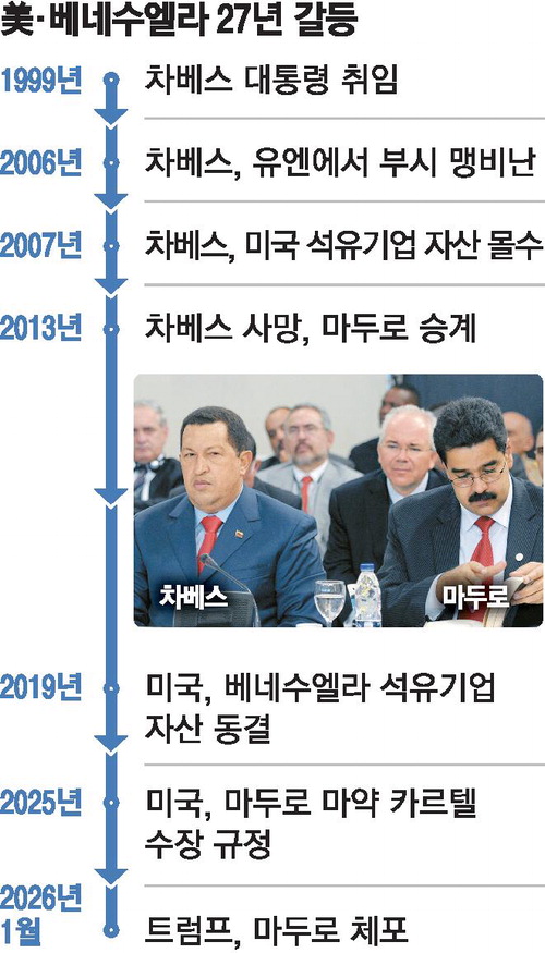 미국과 베네수엘라의 갈등은 27년 전 우고 차베스 베네수엘라 정권 수립 직후 미국 석유기업 자산 몰수와 석유산업 국영화로 시작됐다.차베스는 반미(反美)를 주요 외교 정책으로 삼을 정도였다.