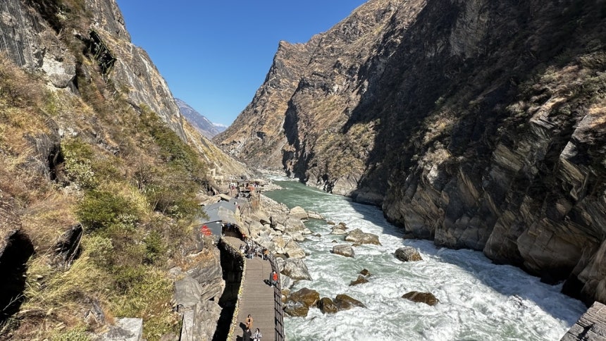 그리고 진사강 남쪽의 리장과 호도협(虎渡峽)을 찾게 된다.그것은 리장이 차마고도의 중심도시고,호도협이 차마고도 관광의 하이라이트이기 때문이다.호도협은 진사강의 폭이 좁아지고 낙차가 큰 지역으로 해발이 1800m에 이른다.길이가 16km 정도에,상류와 하류 사이 낙차가 무려 220m나 된다.그리고 협곡의 가장 넓은 지점이 60m,가장 좁은 지점이 30m 밖에 되질 않는다.그 때문에 물살이 세고 유속이 광장히 빠르다.이곳은 호랑이가 뛰어넘을 수 있을 정도로 좁은 협곡이어서 호도협이라는 지명이 생겨났다.