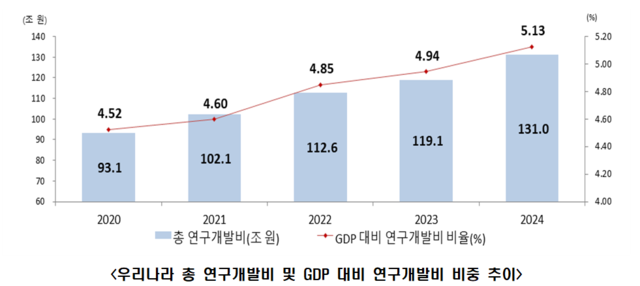 지난해 공공과 민간 영역을 합쳐 연구개발(R&D)에 투입된 비용이 131조원을 넘어선 것으로 나타났다.국내총생산(GDP) 대비 연구개발비 비중은 5.13%를 차지해 이스라엘에 이어 세계 2위를 유지했다.